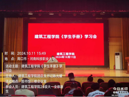 为了帮助新生更好地适应大学生活,提供便捷的学习和生活指南,我院于2024年10月11日下午在图书馆三楼会议室召开建筑工程学院《学生手册》学习会。本次会议由建筑工程学院团总支书记陈光耀主持召开,2024级全体新生参加此次会议。