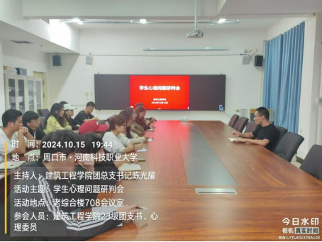 为精准研判学生心理动态,制定有针对性的干预措施,以切实保障学生的心理健康,促进校园环境的和谐与稳定。我院于10月15日在综合楼708会议室召开学生心理问题研判会,旨在分析当前学生中出现的心理健康问题及应对策略措施,此次会议由建筑工程学院团总支书记陈光耀主持召开,2023级各班团支书、心理委员参加会议。