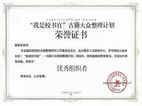 为进一步给高校学生提供了解和接触珍贵古籍、参与线上古籍数字化整理的机会,更好地对中华优秀传统文化予以保护和传承,让古老的文化遗产在现代科技的助力下焕发新生,全国高等院校古籍整理研究工作委员会主办,北大数字人文研究中心、字节跳动公益承办的【“我是校书官”--古籍大众智能整理计划】第二期活动特此开展。在活动中,我院二课分中心主任薛珂因鼓励同学们踊跃参与,给予同学们正确指导,被授予“优秀指导老师”称号!我院2023级本科建筑工程1班雷梦彤同学在活动中积极组织同学参与,表现卓越,被授予“优秀组织者”称号!