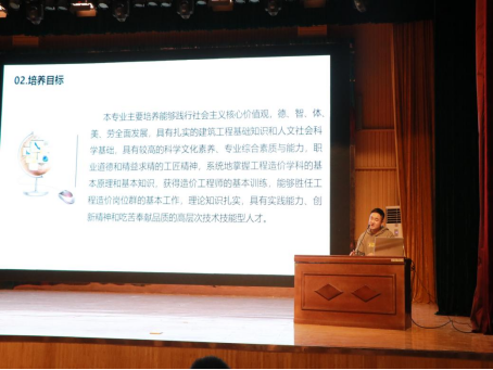 接着,我院王国志老师为同学们讲解工程造价专业。他围绕“专业介绍”、培养目标、“核心课程”以及“就业方向”四个方面对工程造价专业进行了科学系统的分析介绍,着重介绍了本专业的四个要求——知识要求、能力要求、素质要求及专业技能要求,为同学们的后续学习指明了方向。