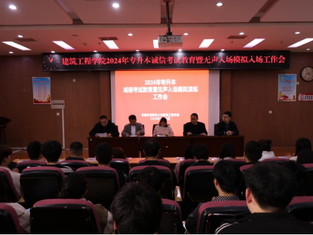 为保证2024年专升本考试工作顺利进行,让考生熟悉考试流程,严肃考风考纪,强化诚信考试教育,建筑工程学院根据学校要求,于2024年3月29日召开2024年专升本诚信考试教育暨无声入场模拟演练工作会。参加本次会议的领导有建筑工程学院院长吴琪、建筑工程学院党支部书记王舜、建筑工程学院副院长赵光磊、建筑工程学院学生管理办公室主任张振,本次会议由建筑工程学院团总支书记陈光耀主持。