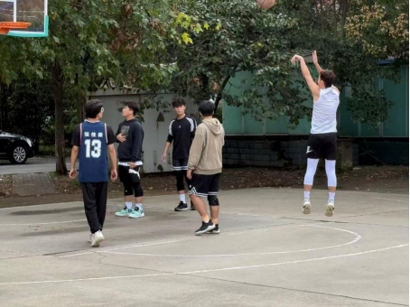 日光斜切过球场,一位穿白色背心的球员屈膝、抬臂,指尖发力的刹那,背心领口随动作微微下拉,篮球擦过指尖,在空中划出一道干净的弧线,直奔篮筐,动作干净利落,彰显建工学子拼搏精神。