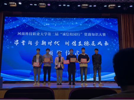 为积极宣传党和国家的学生资助政策与成效,推动我校学生资助工作高质量发展,进一步使同学们更加了解资助政策和金融基础知识,提高大学生的诚信意识和责任意识。近日,校团委举办了第二届以“昂首阔步新时代,树信立德展风采”为主题的“诚信校园行”资助知识大赛。经过激烈的比拼,我院在此次知识大赛中荣获了道德风尚奖,梁树清、常芷恺、许柯同学也为我院取得铜奖的成绩。同时我院陈光耀书记被评为优秀指导教师,梁树清同学也荣获了优秀选手奖。