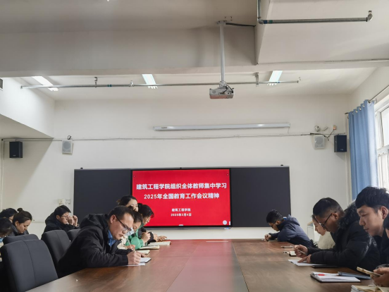 随后,建筑工程学院副院长刘志刚带领全体教师深入学习了会议的核心要点,包括加强教育系统党的建设、推动教育科技人才良性循环、以人民为中心发展教育、实施教育家精神铸魂强师行动、健全教育国际战略合作体系、推进教育数字化战略以及巩固教育系统安全稳定态势。全体教师认真聆听、仔细记录,深刻领会会议精神内涵。大家充分认识到教育在强国建设中的重要地位,明确了自身肩负的责任与使命。