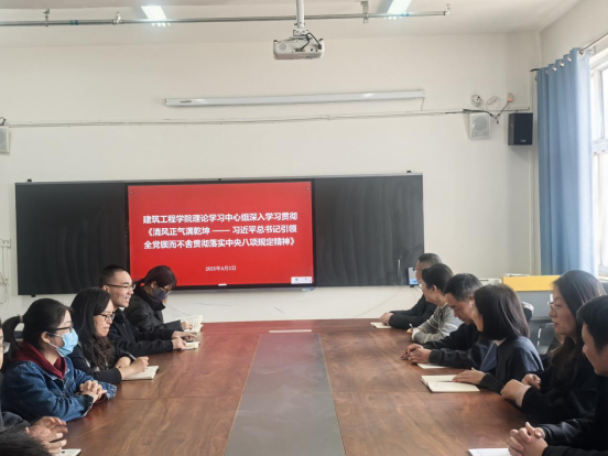 为深入贯彻落实中央八项规定精神,持续深化作风建设,2025年4 月 2 日上午,建筑工程学院党总支理论学习中心组在综合楼 708 会议室开展专题学习,重点研读《清风正气满乾坤 —— 习近平总书记引领全党锲而不舍贯彻落实中央八项规定精神》,建筑工程学院党总支书记王舜主持会议并领学。