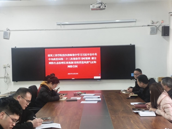 2025年12月23日,建筑工程学院组织全体教师开展专题学习会,深入学习习近平总书记在中共中央政治局第二十三次集体学习时关于健全网络生态治理长效机制、推进清朗网络空间的重要讲话精神。
