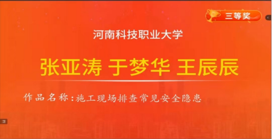 在比赛的闭幕式中,闫明宇同学作为学生代表发言:他说:“非常开心能获得本次大赛的第一名,在此感谢主办方和承办方对本次比赛的大力支持,在疫情当下能安全成功举办本次比赛离不开他们的大力支持,感谢他们为本次比赛的付出,同时感谢学校和学院为我们提供比赛场地和各种支持;同时通过比赛的形式,让我们学习到很多关于建筑安全方面的知识,为我们以后的工作打下基础,受益良多,再次感谢所有为本次比赛大赛付出的各位工作人员和老师。”