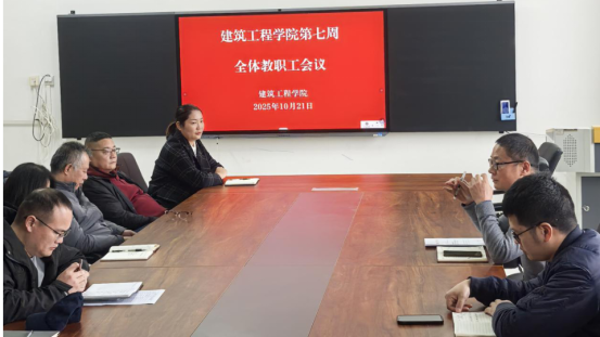 2025年10月21日下午,河南科技职业大学建筑工程学院在综合楼708室召开了第七周全体教职工会议。会议由学院副院长赵光磊主持,学院党总支书记王舜等学院领导及全体教职工参加了此次会议。