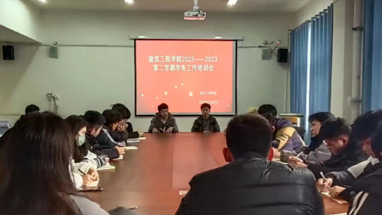 建筑工程学院教务办联合学生学务工作者于2023年02月22日成功召开了“建筑工程学院2022-2023学年第二学期学务工作培训会”,本次会议的主题是全面讨论和分析本学期各年级学习负责人及各班学习委员的工作内容和注意事项。出席本次会议的有建筑工程学院教务办张志博主任、王晓宇老师、各年级学习负责人和各班学习委员。