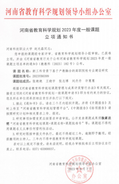 金秋九月,丹桂飘香,学院教育科学研究再结硕果,由学院副院长赵光磊主持的课题《新工科背景下基于产教融合的高职院校专业建设研究》获河南省教育科学规划2023年度一般课题立项。