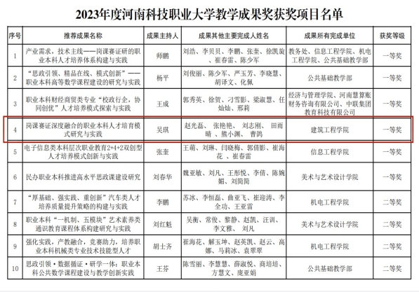 根据《河南科技职业大学关于组织开展2023年度校级教学成果奖评选工作的通知》(校政发〔2023〕210号),建筑工程学院吴琪院长团队喜获一等奖,田雨晴团队获三等奖。
