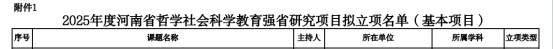 根据《中共河南省委教育工委办公室河南省教育厅办公室关于2025年度河南省哲学社会科学教育强省研究项目申报工作的通知》(豫教工委〔2024〕32号)要求,经学校推荐、专家评审,我院2025年度河南省哲学社会科学教育强省研究项目拟立项2项(指导性计划2项)。具体名单见附件。