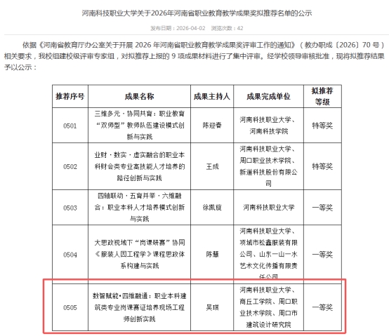 近日,河南省职业教育教学成果奖申报工作启动,我院紧扣职业本科办学定位,聚焦数智赋能、岗课赛证四维融通育人模式,凝练系列教学改革成果,2026年4月2日经学校专家评审、公示,成功获得学校推荐资格,将代表学校角逐省级教学成果奖。