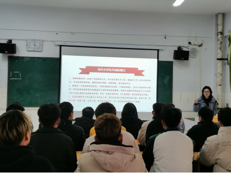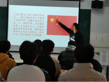 本次课程共分为国旗、国徽、国歌、升国旗仪式的意义、怎样践行爱国主义五个部分。首先由团总支陈光耀书记带领大家共同学习国旗的组成和各个组成元素的含义,及国旗的发展史,向同学们传递爱国主义精神,陈书记讲述道:“五星红旗是中华人民共和国的标志和象征。五星红旗作为中华民族五千年历史上第一面代表全体人民意志的民族之旗、团结之旗、胜利之旗、希望之旗、吉祥之旗”。通过陈书记的讲述,同学们了解到五星红旗是由上海人曾联松所设计,一颗大星就代表了中国共产党的领导;四颗小星表示工、农、士、商的平等。中华人民共和国国徽中间是五星照耀下的天安门,周围是谷穗和齿轮。在陈书记带领同学们唱完国歌之后,由马嫚婷辅导员为我们普及升旗的意义以及升旗的礼仪,作为大学生要树立民族自尊心和民族自豪感,增强爱国的情感和振兴祖国的责任感。