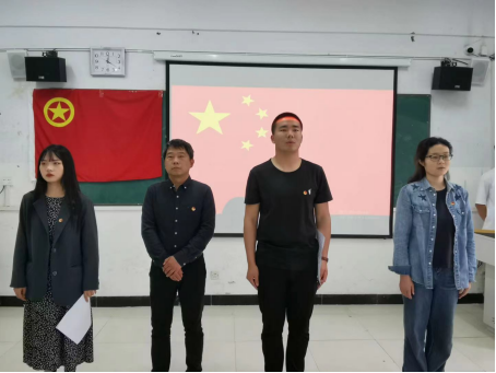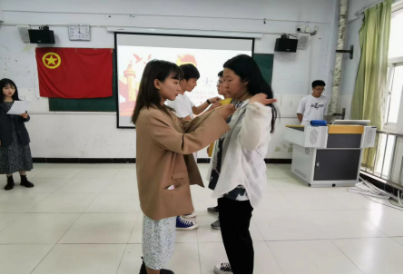 宣誓大会开始,由陈烽睿同学致宣誓大会开幕词,仪式在新老团员们激昂的国歌、共青团歌中开始,他们把自己对共青团生活的向往全部展现出来,全体成员目视前方全神贯注凝视团旗。新老团员青年们热情高涨,因为今天入团积极分子们正式加入共青团这个大家庭,为团组织输送了新的血液,提供年轻力量。接着,由老团员们向所有新团员佩戴团徽。接下来便是庄重的入团宣誓,团员青年们将右拳举起过肩,面对团旗庄严宣誓,话语铿锵有力。在高喊出自己名字的那一刻,新团员们肩负起了作为一个团员青年光荣而艰巨的责任。同学们用誓词表达了对共青团组织的无限向往和为团组织增光添彩的豪迈激情。在鲜红的团旗背景下,此刻的宣誓将激励团员们在今后的学习、工作以及生活中不断向前迈进。