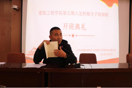 为深入学习贯彻习近平新时代中国特色社会主义思想和党的十九届五中全会精神,切实做好发展党员工作,进一步加强入党积极分子的教育与培养。我院特于2021年11月1日于综合楼西北一阶梯教室第五期入党积极分子培训班开班典礼。出席本次会议的领导、老师有:中共河南科技职业大学建筑工程学院支部委员会王舜书记、共青团河南科技职业大学建筑工程学院总支部委员会陈光耀书记、学生管理办公室马嫚婷老师。
