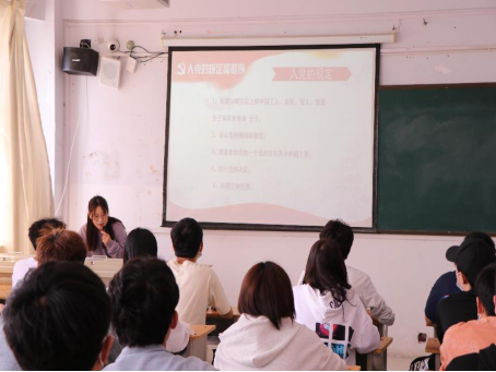课上,刘丹丹老师以“争做合格共产党员”为主题,分四个部分进行讲解。第一部分,端正入党动机;第二部分,党员的权利和义务;第三部分,入党的规定和程序;第四部分,入党材料撰写的要求与规定。对这四个方面进行了全面准确、深入浅出的宣讲,深刻阐明了合格党员标准的主要内容和重点任务。刘丹丹老师指出,百年来中国共产党能带领中国人民取得如此巨大的成功绝非偶然,中国共产党的远大理想追求、科学理论引领、严明纪律规矩、自我革命精神、强大领导能力等诸多优秀特质,都使中国共产党始终走在时代前列。全体积极分子要认真学习“党员标准”,提高党性修养,为实现中华民族伟大复兴的中国梦贡献自己的力量。