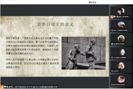 会上,团总支学生副书记刘夏旖同学给同学们讲述国家公祭日的由来,带领学生通过观看图片、视频等方式讲述南京大屠杀事件,让同学们将这些历史铭记于心,同时也激发学生内心深处的爱国情怀,让学生体会到如今幸福生活的来之不易,从而更加懂得珍惜与感恩。王然同学也发出倡议:八十四年过去了,岁月的风雨,早已把斑斑血迹楚楚呻吟洗去,江南的冬天,阳光还是那样和暖地照耀着,昨天的苦难,似乎已经退隐于参天的楼群的背影里。可是,当警世的钟声沉沉地敲响,屈辱的记忆又被清醒地唤起。忘记历史,就意味着背叛;铭记国耻,才能让民族的自强不息的精神,永远在炎黄子孙的血管里滚涌,澎湃,沸腾。作为一个中国人,要时刻牢记南京大屠杀给我们带来的伤痛。