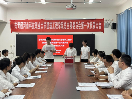 为了进一步加强基层团组织建设,提升团总支的凝聚力和战斗力,推动学院团建工作和各项事业高质量发展,我院于2025年5月26日在综合楼708会议室召开了共青团河南科技职业大学建筑工程学院总支部委员会第一次代表大会。本次会议由建筑工程学院团总支书记陈光耀主持,建筑工程学院党总支书记王舜、就业办主任王晓宇出席会议,学院全体正式代表参与此次会议。